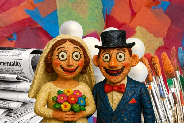 Brudparet får sitt liv inbakat i papier-mâché: en kompott av minnen, hemligheter, drömmar och dråpliga detaljer.