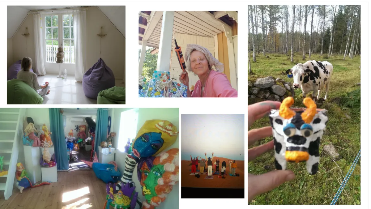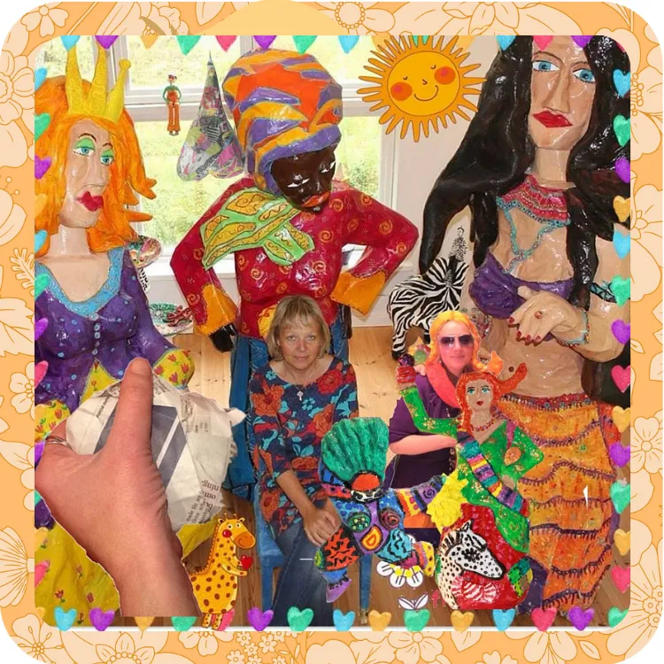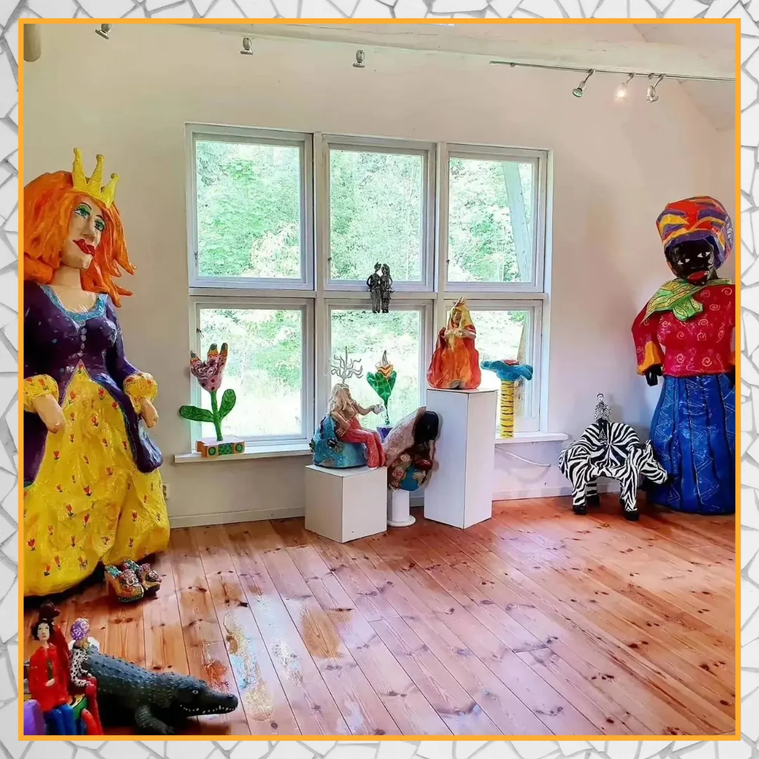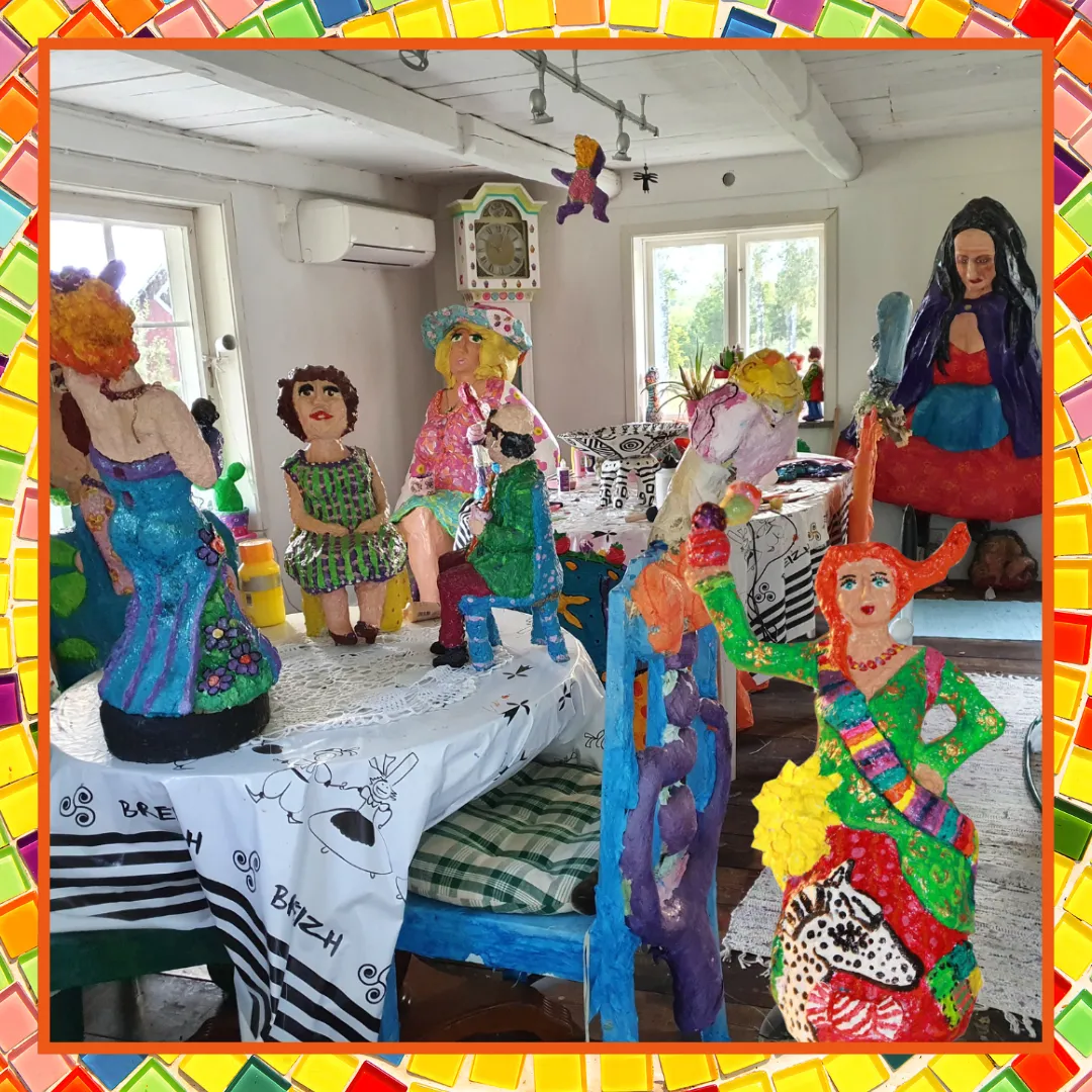 Jag ha skapat mitt eget Wonderland – en värld av sagor, myter, regnbågsfärger och mustiga kvinnor i papier mâché. Mitt hem och ateljé ligger i småländska skogen, där nätterna är svarta som sammet och månen är min gatlykta. Här lever jag med mina hundar, min katt och mina hästar, nära naturens rytmer och väderomslag.